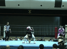 This is going to be even more silly than the last match, between it being a triple threat and having two comedy wrestlers. They dance around to start with Yamagata being the only one doing any real offense. Yamagata punches Lee but Nipponbashi breaks up the cover, she gets out the wand and flings the referee to the mat. Yamagata gets the wand but it doesn’t work for her so she hits Lee with it instead. They all get some papers and read them, and no I don’t know what is going on. This goes on for several minutes. It finally ends and Lee is kicked by both her opponents, Nipponbashi rolls up Yamagata but Lee breaks up the cover. Yamagata boots Nipponbashi in the head and puts Lee in a facelock, and Lee quickly submits! Yamagata wins.