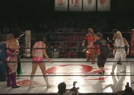 Yoneyama and Yamashita begin the match for their teams, they try to knock each other over until Yoneyama sneaks in a quick schoolboy. Yamashita fires back with a shoulderblock, Matsumoto comes in and they double team Yoneyama. Matsumoto stays in and throws down Yoneyama by the hair before hitting a dropkick, delayed scoop slam by Matsumoto and she covers her for two. Matsumoto tags Yamashita, scoop slam by Yamashita and Matsumoto comes back in so she can hit an assisted double kneedrop. Crab hold by Yamashita but Kuragaki has seen enough and she breaks it up. Yoneyama hits a double armdrag on Yamashita and Matsumoto, then both she and Kuragaki double team them in the corner. Kuragaki stays in and hits a delayed vertical suplex on Yamashita, getting a two count. Scorpion Deathlock by Kuragaki, but Yamashita gets a hand in the ropes to force a break. Kuragaki tags in Yoneyama, running senton by Yoneyama but Yamashita fires back with a shoulderblock. Lariat by Yamashita and she knees Yoneyama in the face, covering her for two. She tags in Matsumoto, lariat by Matsumoto and she puts Yoneyama in a backbreaker before flipping her over into a gutbuster.