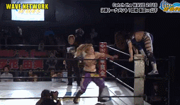 I predict lots of lariats! After the introductory exchanging of holds, Yamashita hits a hard shoulderblock which sends Iida flying to the mat. Yamashita throws Iida in the corner and hits a series of chops, but Iida puts her in short armbar. Yamashita gets into the ropes to force a break, Iida keeps working on the arm before re-applying an armbar. Knees by Iida and she hits an armbreaker, but Yamashita slides behind her and applies a sleeper. Iida quickly gets out of it and goes back to Yamashita’s arm, but Yamashita picks her up and hits a bodyslam. Iida manages to slap on the cross armbreaker, but Yamashita gets a boot on the bottom rope. Yamashita slams Iida in the corner but Iida avoids her charge and snaps her arm over the top rope. Iida goes up top but Yamashita lariats her, sending Iida crashing out of the ring. Yamashita goes out after her and goes for a lariat, but Iida ducks and Yamashita lariats the ring post. Back in the ring, Iida goes up top and she delivers a missile dropkick for two. Rolling Fisherman Suplexes by Iida, she uppercuts Yamashita but Yamashita avoids the dropkick. Lariat by Yamashita in the corner and she hits a backdrop suplex, but Iida gets back in control and goes back to the arm. Dropkick by Iida while Yamashita is against the ropes and she hits a second one, followed by a third. Iida goes off the ropes but this time Yamashita catches her with a lariat. They both slowly get up and trade strikes, lariats by Yamashita, kick to the chest by Yamashita and she covers Iida for two. Yamashita gets on the second turnbuckle and hits a diving elbow drop, getting another two count. Yamashita goes off the ropes, Iida avoids her charge but Yamashita hits a backdrop suplex anyway. Sleeper by Yamashita but Iida rolls out of it and applies a quick pin for two. Iida goes off the ropes but Yamashita hits a quick lariat, she goes for another one but Iida avoids it. Sliding Lariat by Yamashita, but Iida barely gets a shoulder up on the cover. Another lariat by Yamashita, and this time she picks up the three count! Rina Yamashita is your winner and moves on in Catch the WAVE.