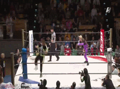 KAORU comes in and boots Shida, running elbow by Chisako and she hits a catapult footstomp. Suplex hold by Chisako, but Syuri breaks up the cover. Chisako goes up top but Shida joins her, she goes for a suplex but Chisako pulls her out of the ring. All hell breaks loose as Syuri chases KAORU around the crowd with her new club, a table is set up at ringside by someone and KAORU puts Shida on the table. Chisako goes up to the top turnbuckle and nails the diving footstomp onto Shida, but the table doesn’t break. That looked incredibly painful. They eventually get back in the ring and bring a ladder with them, and Syuri throws Chisako into the ladder. Syuri gets her club and breaks the pieces of table with it, Shida grabs the ladder and rams both KAORU and Chisako. Suplex by Shida to Chisako and she hits the Three Count for two. Shida hits a superplex on Chisako onto a steel chair, but KAORU breaks up the pin. Shida sets up the ladder and climbs it with a kendo stick in her hand, but KAORU tips it over. KAORU puts the ladder around her neck and does the Terry Funk spot, she puts the ladder back down and she lays it across both Shida and Syuri. Chisako goes up top and hits a footstomp onto the ladder, double cover but Shida and Syuri both kick out. Chisako goes up the ladder but Shida throws the kendo stick at her and hits a Falcon Arrow for two. Shida and Chisako both climb the ladder, and Chisako hits Shida with a piece of table which sends her down to the mat. KAORU goes up top and hits a perfect Valkyrie Splash, Chisako then hits the Hormone Splash off the top of the ladder for the three count! Chisako and KAORU win the match.