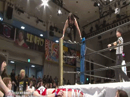 After starting politely with a tie-up, Miyagi snapmares Yoshiko to the mat and kicks her a few times in the head. Yoshiko gets back up and shoulderblocks Miyagi, but Miyagi pulls Yoshiko down by her hair. Lariat by Yoshiko in the corner and she hits bootscrapes followed by a running boot to the face. Elbows by Yoshiko and she slides out to the apron, but Miyagi applies a sleeper over the top rope. Miyagi knocks Yoshiko to the floor and rams her head repeatedly into the apron, they brawl up into the bleachers with Miyagi staying in control. Yoshiko comes back as she rams Miyagi’s head into the ring post, they return to the ring and Yoshiko hits a scoop slam. Miyagi avoids her next attack and hits a series of dropkicks, she gets on the second turnbuckle and delivers a missile dropkick for two. Miyagi tries to pick up Yoshiko but is knocked back, knees by Yoshiko and she hits a lariat off the second turnbuckle. Miyagi and Yoshiko trade elbows, Miyagi ducks a lariat and slams Yoshiko to the mat for another two count. Backdrop suplex by Miyagi, she goes all the way up top but Yoshiko joins her and gets Miyagi on her shoulders. Yoshiko drops Miyagi to the mat, she quickly follows with a diving senton and she picks up the three count! Yoshiko is your winner.