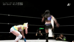 Starlight Kid charges AZM as the match starts, AZM goes for an armdrag but Starlight Kid lands on her feet. AZM connects with the next armdrag and they trade trips before reaching a stalemate back on their feet. AZM fakes a handshake and goes for a kick, Starlight Kid catches it and they take turns throwing each other to the mat by the head. They trade elbows and dropkicks, Starlight Kid kips up but AZM kicks her in the chest. Kicks to the back by AZM and she puts Starlight Kid in a camel clutch, after a moment she releases the hold and sets up Starlight Kid in the ropes. Dropkick to the back by AZM but Starlight Kid trips her when she goes for a second one, she goes for a Tiger Feint Kick but AZM ducks. Starlight Kid hits the move on the lower ropes instead, standing moonsault by Starlight Kid and she covers AZM for two. Irish whip by Starlight Kid to the corner and she delivers a dropkick, but AZM dropkicks her back. Rebound crossbody by AZM but Starlight Kid dropkicks her, and both wrestlers are down on the mat. Starlight Kid is up first, she trips AZM and puts her in a crab hold, but AZM rolls out of it and they trade flash pins. Back up, high kicks by AZM and she covers Starlight Kid for a two count. AZM runs to the corner and goes for a triple jump attack, but Starlight Kid kicks her in the stomach and hits the cyclone suplex. Starlight Kid goes up top and she nails the swivel body press, cover by Starlight Kid and she picks up the three count! Starlight Kid is the first Future of Stardom Champion!