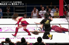 Utami comes in and slams Natsuko, running Somato by Momo but Hazuki breaks up the cover. Hazuki stays in and kicks Momo, Momo kicks them both but is caught by a Code Breaker by Hazuki and a spear by Natsuko. Natsuko goes up top and hits a diving body press, but Utami breaks up he cover. Utami throws Hazuki out of the ring, she goes to Natsuko but Hazuki hits a swandive dropkick on both Momo and Utami. Natsuko grabs Momo and slams her in front of the corner, Natsuko goes up top and hits another diving body press followed by another one before Hazuki drops Momo with a brainbuster. Natsuko goes up top again and hit a third diving body press, but Momo gets a shoulder up on the cover. Natsuko picks up Momo and hits a swinging side slam, but again Momo kicks out. Natsuko picks up Momo but Momo elbows her, Natsuko fires back with a spear and goes up top, hitting a diving leg drop for a two count when Utami breaks it up. Hazuki comes in but Utami drops her with a release German, she hits Natsuko with a lariat and then assists Momo in delivering the B Driver. Momo waits for Natsuko to get up and hits a high kick, half and half suplex hold by Momo but Hazuki breaks up the pin. Momo picks up Natsuko and nails the Peach Sunrise, and she picks up the three count! Momo Watanabe and Utami Hayashishita are still the champions.