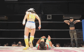 Jungle and Natsuko both attack Hiroyo as the match starts, since there are no rules in the jungle, Kaori comes in to help but Jungle tosses her out of the ring. Natsuko and Jungle both shoulderblock Hiroyo to the mat, Kaori returns but Jungle suplexes her next to Hiroyo. Natsuko hits a running senton on both of them, Jungle goes for a body press but Hiroyo moves so she only hits Kaori. Jungle is knocked out of the ring, leaving just Hiroyo and Natsuko as the legal wrestlers. Hiroyo shoulderblocks Natsuko and catapults her into the mat, Kaori runs in and hits a senton before Hiroyo connects with a dropkick. Hiroyo tags in Kaori as they take turns beating down the rookie, but Natsuko plants Kaori with a spear and makes the tag to Jungle. Jungle shoulderblocks Kaori but Jungle snaps her neck over the top rope, she gets in the ring but Jungle hits a jumping crossbody onto both of them. Jungle picks up Kaori and slams her upside down in the corner, Natsuko comes in and both connect with running strikes. Jungle covers Kaori, but it gets a two count. Jungle picks up Kaori but Kaori quickly hits a DDT and knees Jungle in the back of the head. She tags Hiroyo, Hiroyo goes up top and delivers a missile dropkick for two. Hiroyo gets Jungle on her shoulders, Natsuko runs in but Hiroyo throws Jungle at her.