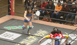 This will be a more serious match, but it also has a brand new wrestler. Itoh is an idol singer that just had her first match three weeks ago, so needless to say she is a bit green. Reika just started wrestling last March but she is a powerhouse and is already pretty smooth in the ring. Reika is an idol singer as well, so its sorta singer vs. singer (although I think both are in pretty low-level groups). She was trained in the W-1 Academy so she has the basics down pat, she joined up with Tokyo Joshi Pro soon after debuting.